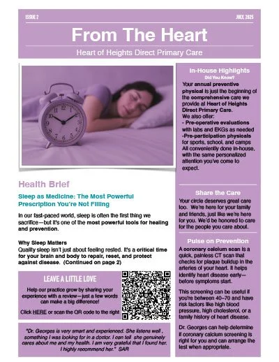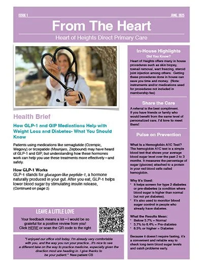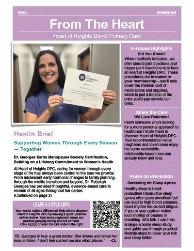 Curious about what’s happening inside Heart of Heights DPC? Each month, I share a mix of evidence-based clinical updates, wellness pearls, practice highlights, and the milestone moments that make Heart of Heights special. I genuinely love putting this newsletter together—it allows me to keep you informed about current topics, reinforce preventive health, and make sure you’re taking full advantage of everything Heart of Heights offers. As a lifelong educator and former faculty member for Family Medicine residents and medical students, teaching has always been at the core of my work. I’m grateful to continue that role through these monthly newsletters and through the conversations we share in clinic and beyond. Come see what’s new this month… From the Heart.